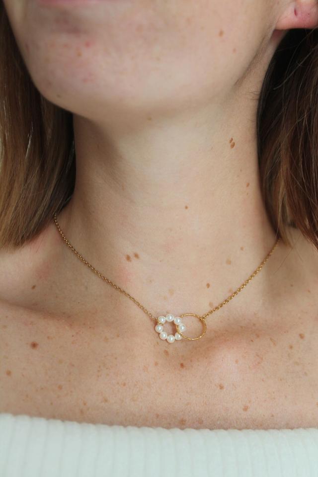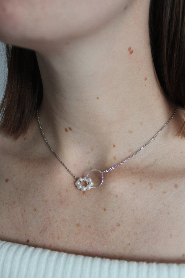 Collier avec anneau diamanté et anneau de perles